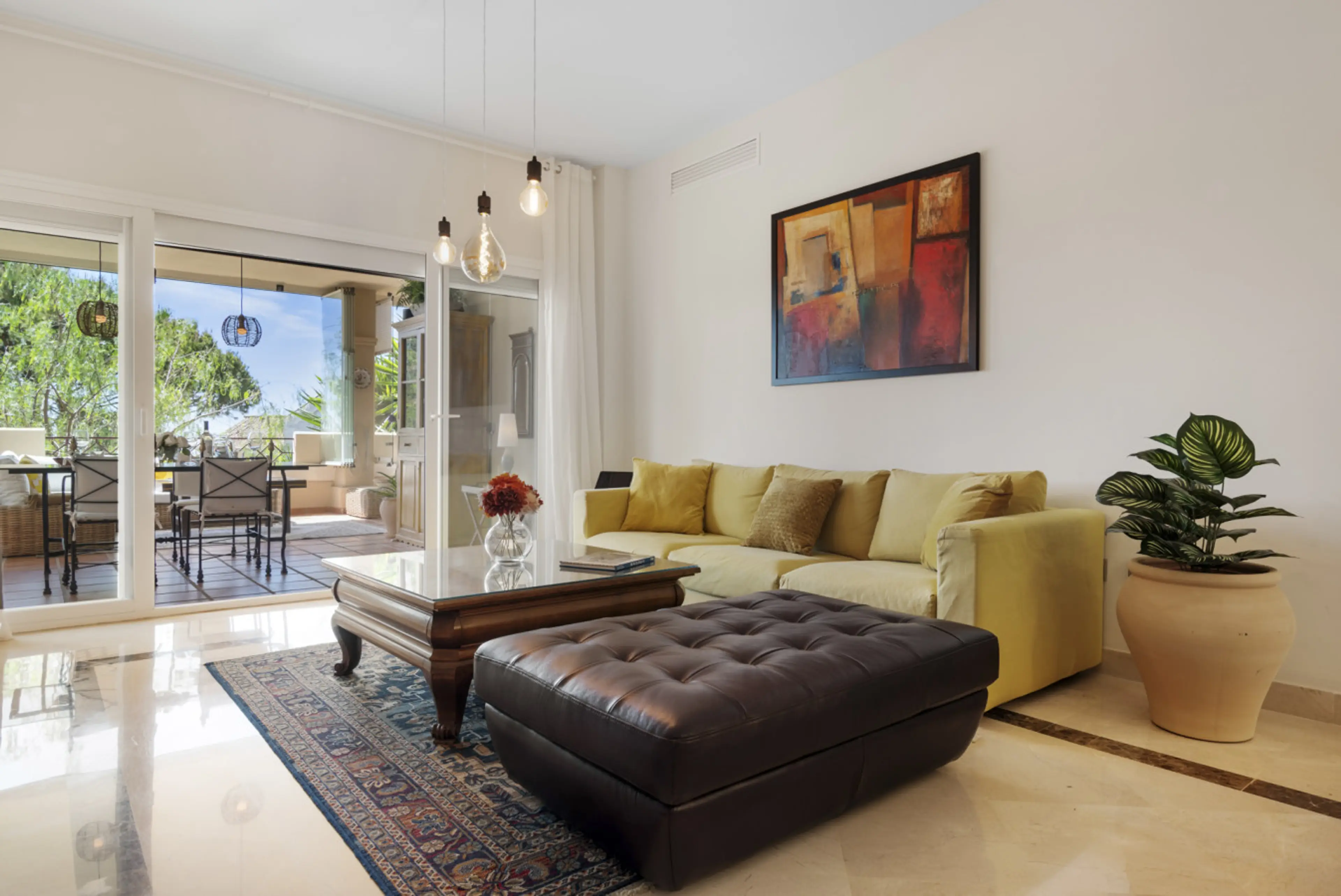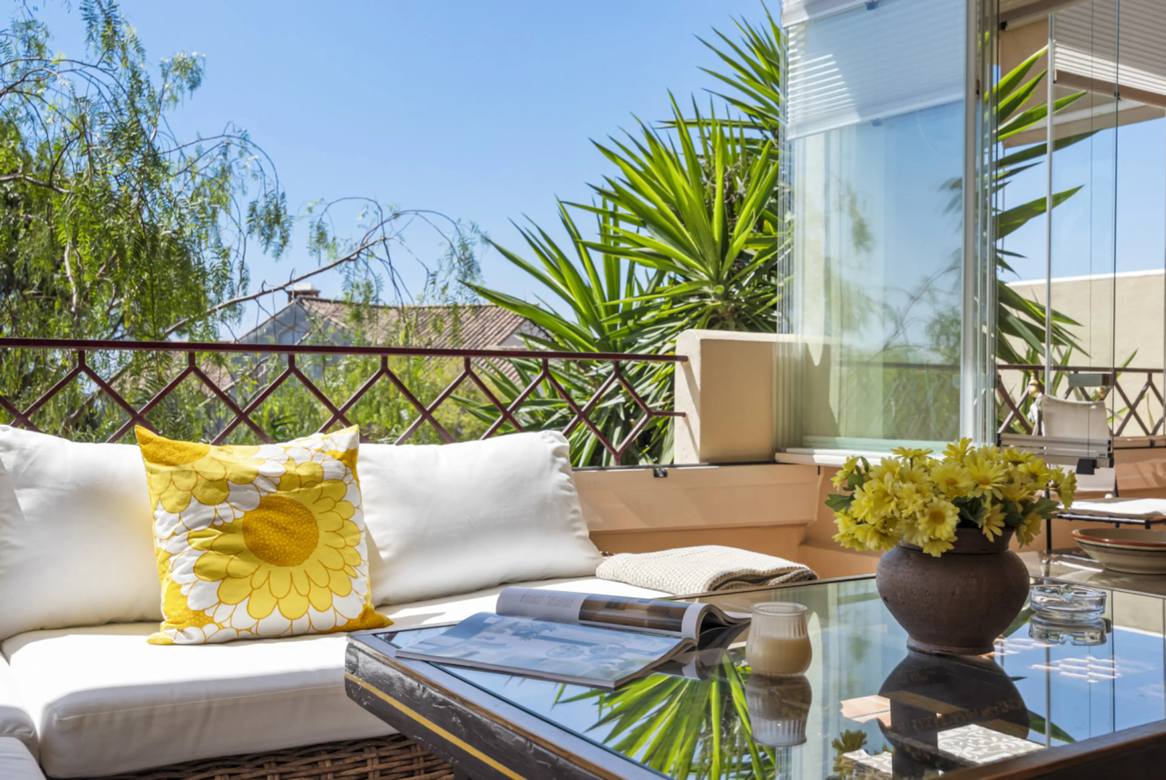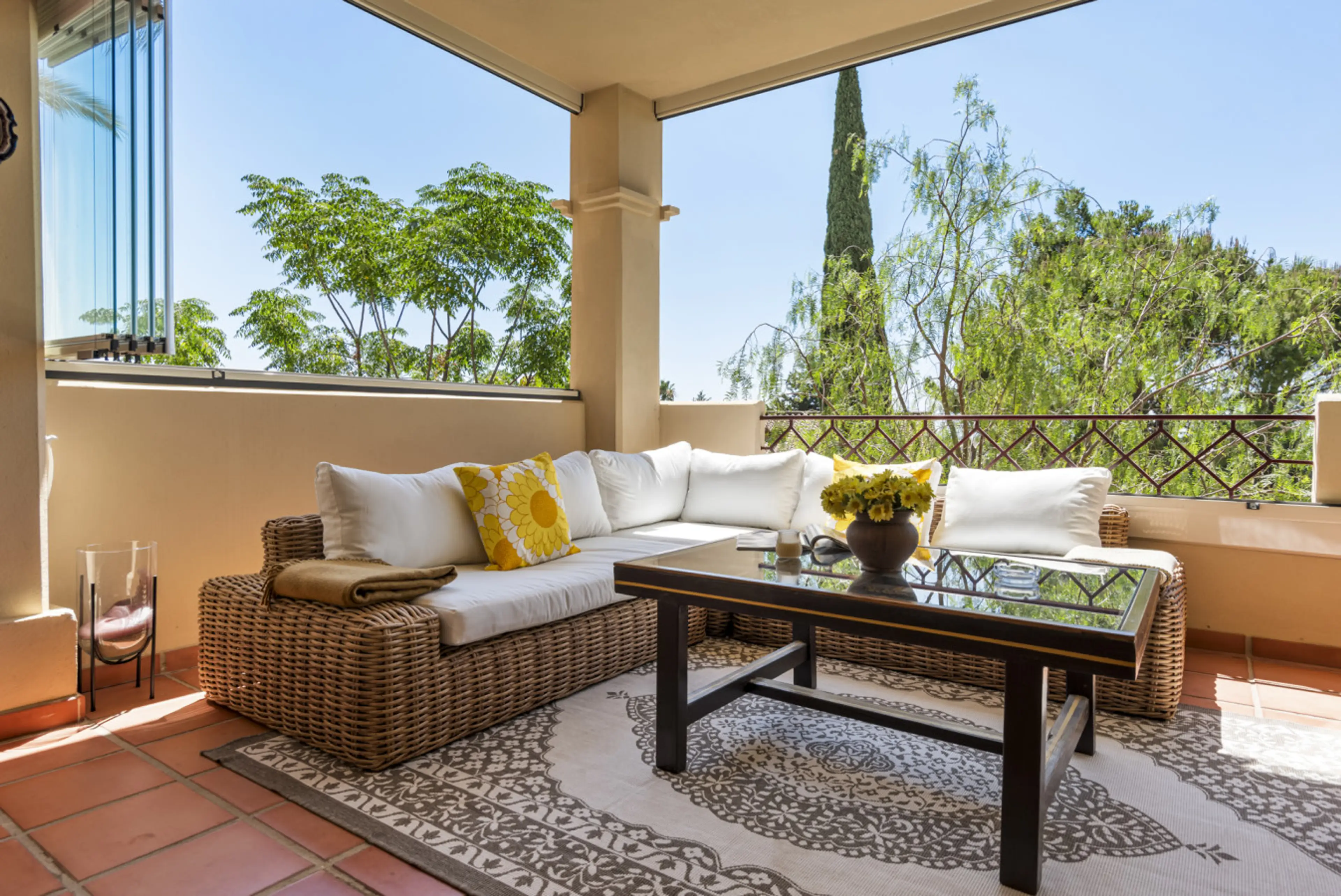 But the highlight is the 40 m² south-facing terrace with views of the Marbella mountains and the sea. The glass enclosure can be closed on cooler evenings, so the terrace can also be used in the winter months. We spent many hours there.
